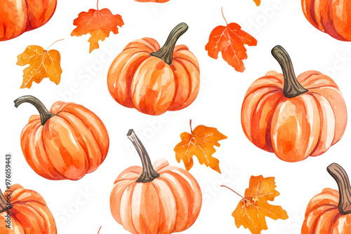 Fall pumpkins seamless pattern hand drawn by watercolor. Thanksgiving background.
