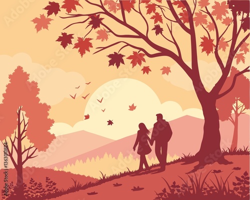 Fall Silhouette Art: Romantic Couple Walking in Autumn Scenery Illustrations