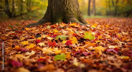 Fallen autumn leaves carpet the ground around a tree trunk