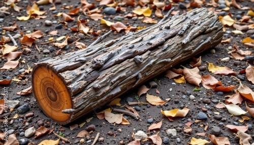 Fallen Log Landscape A scene featuring a fallen log surrounded by dirt, leaves, and small stones, highlighting the cycle of nature.