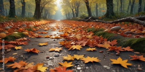 Fallen maple leaves crunching underfoot on a forest path near pumpkins, nature, autumn