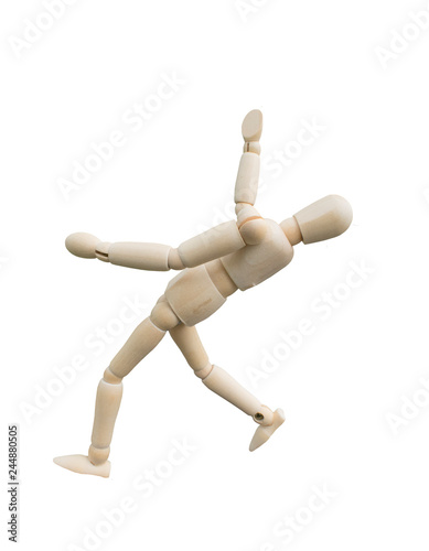 Falling accident concept. Wooden puppet act like slip down the floor on white background.