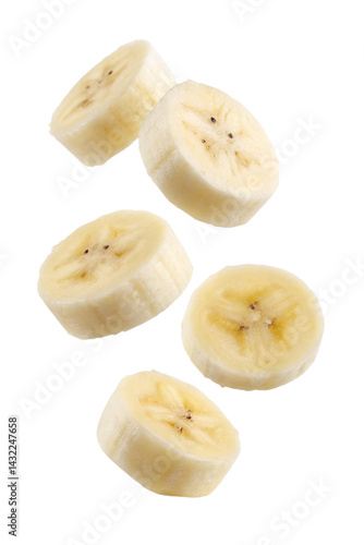 Falling banana slice, peeled fruit isolated on transparent background
