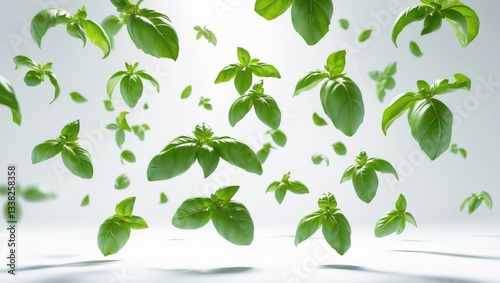 Falling basil leaves, on a white background, with clipping path and full depth of field.