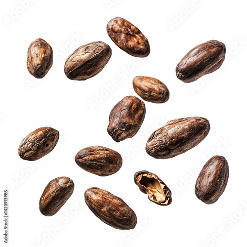 Falling cacao beans isolated on transparent background