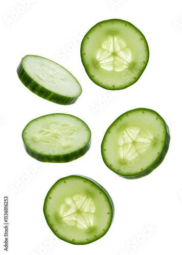 Falling cucumber slices PNG. Fresh cucumbers summer food isolated. Green cucumber rounds tumbling down png for diet food visuals and vegetarian design content