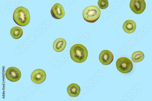 Falling cut kiwi on color background