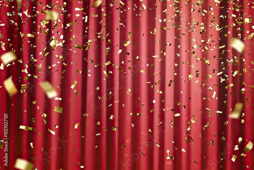 Falling golden confetti isolated on red curtain background. Vector festive background. with generative ai
