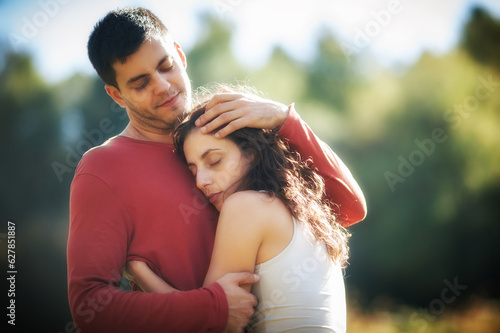 Falling in love. Romantic couple hugging and enjoying in in love in nature outdoor. Love, relationship and romance concept. Girlfriend and boyfriend dating