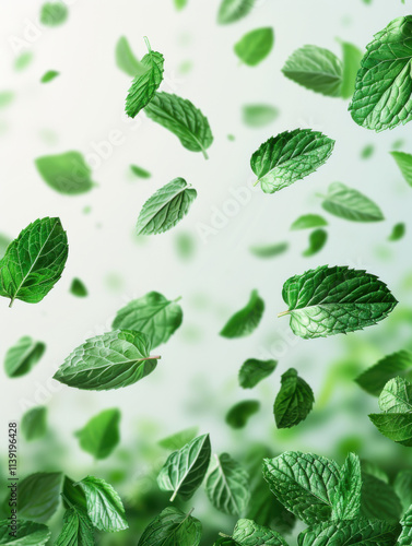 Falling juicy Mint leaves with green leaves isolated on transparent background.