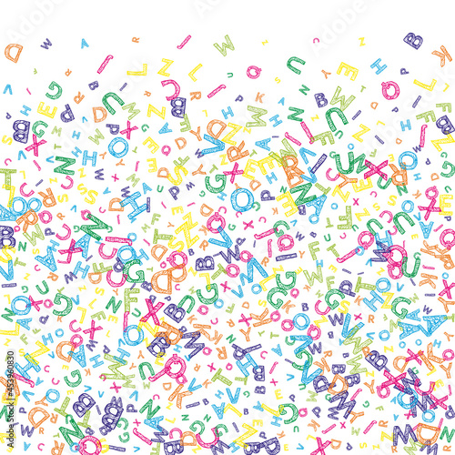 Falling letters of English language. Colorful messy sketch flying words of Latin alphabet. Foreign languages study concept. Fancy back to school banner on white background.