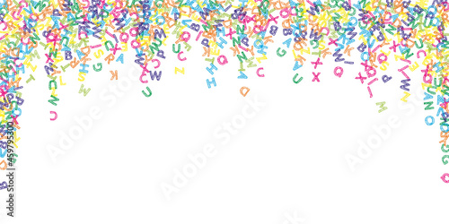 Falling letters of English language. Colorful sketch flying words of Latin alphabet. Foreign languages study concept. Symmetrical back to school banner on white background.