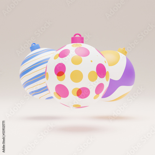 Falling luxury golden 3d christmas ball with pattern on light background. 3d rendering Happy New Year Luxury background with colorful bauble ball