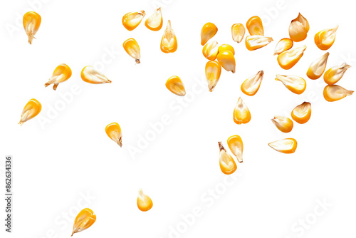 Falling of yellow Corn seeds isolated on background, flat lay organic grains fly in the air.