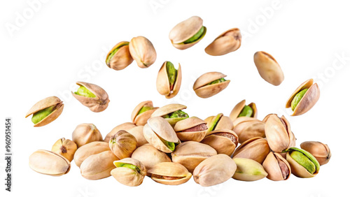 Falling pistachio nuts isolated on a white background.