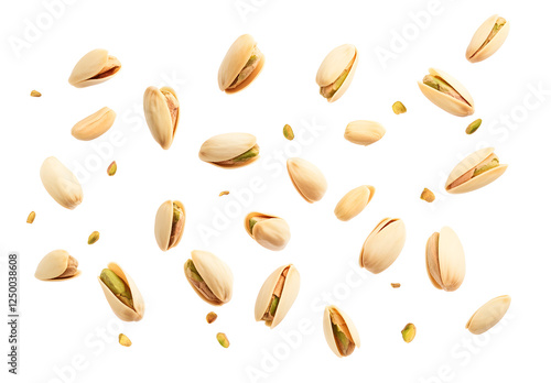 Falling pistachios isolated on a white background, creating a pattern or banner. Flat lay, top view, high-resolution photo.