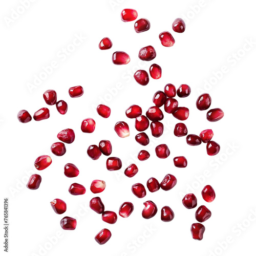 Falling pomegranate seeds isolated on transparent background. Top view.