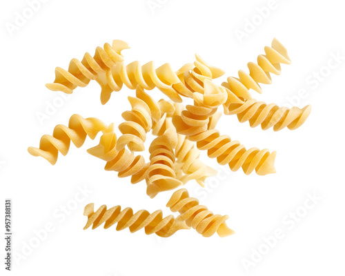 Falling Raw Fusilli and Rotini Pasta, Uncooked Italian Twists, Isolated on a Transparent PNG Background