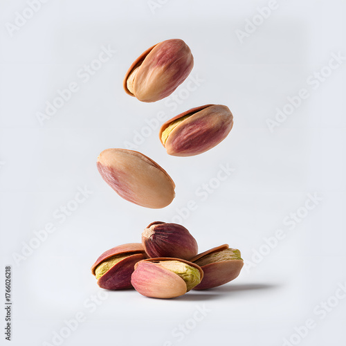 Falling roasted pistachios in motion with pile at the bottom, isolated on light background, conceptual minimal food composition