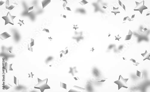 Falling shiny silver confetti, stars and pieces of serpentine isolated on white background. Bright festive overlay effect with gray tinsels. Vector illustration.