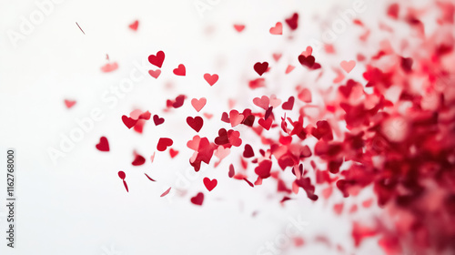 Falling small red paper hearts on a white background, perfect for Valentine's Day or wedding-themed web banners