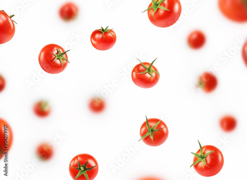 Falling tomato isolated on white background, full depth of field. Tomato seeds. Freshness.
