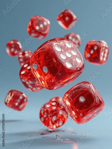 Falling translucent red dice with white pips in mid-air