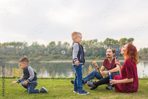 Family and nature concept - Mother, father and their children playing with colorful soap bubbles
