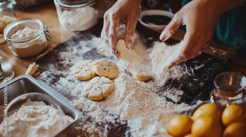 Family baking Christmas cookies in a cozy kitchen, flour and ingredients scattered around