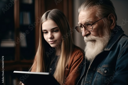 Family Bonding Through Technology: Adult Daughter Visiting Her Senior Father at Home, Sharing Quality Time and Using a Tablet Together