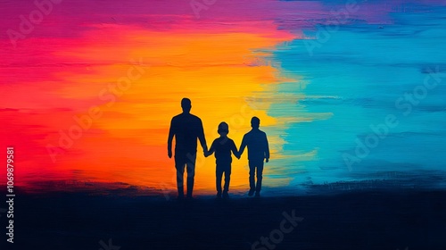 Family Bonds: Silhouettes Walking Hand in Hand Against a Vivid Sunset Background of Colorful Bliss. Property Loan and Credit Concept