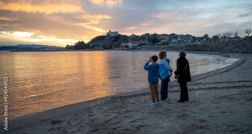 Family capturing a sunset moment on a beach, with a coastal town in the background