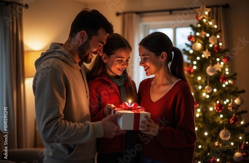 Family Christmas time, Mom and Dad Give a Gift to a Child