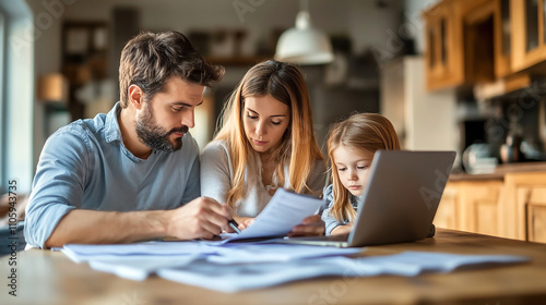 Family discussing insurance options at home with documents and laptop