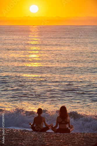 family doing yoga outdoors at sunrise on the beach - Women and child meditating together at morning time - Fitness exercise concept for healthy lifestyle and positive mind