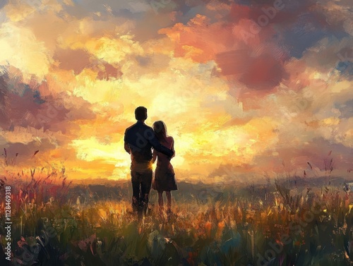 Family embracing at sunset, peaceful atmosphere, mood of love and hope