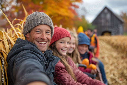 Family enjoying a hayride amidst vibrant autumn foliage in a rural setting