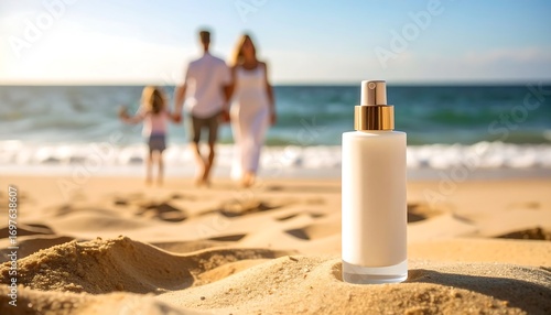 Family enjoying beach, sunscreen bottle