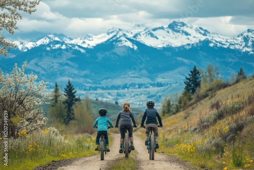 Family enjoys cycling along a mountain trail surrounded by snow-capped peaks