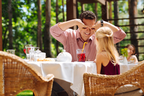Family entertainment. Smiling happy father feeling wonderful while entertaining his blonde-haired daughter