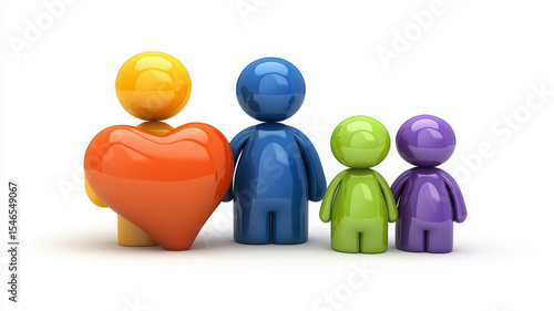 Family figures with colorful heart symbol, diversity, unity, and love on white background