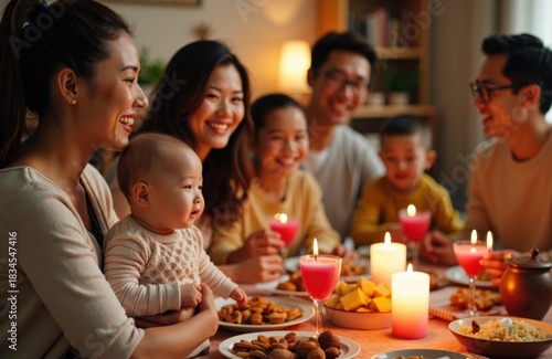 Family gathering around a candlelit dinner table sharing food and warm smiles
