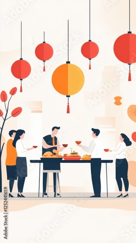 Family Gathering Around a Table Celebrating Festival with Red Lanterns and Traditional Food