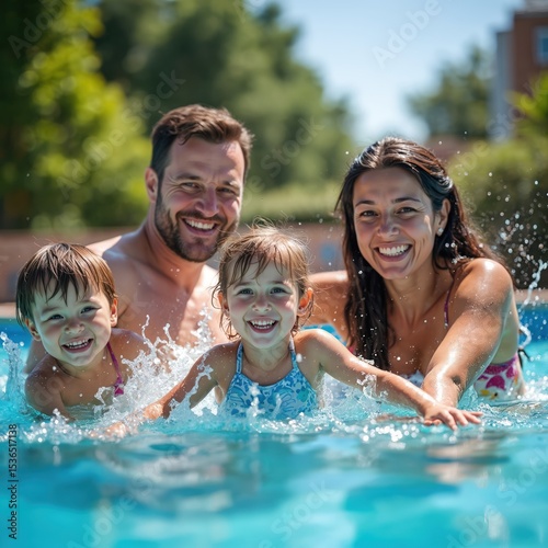 Family having fun playing in swimming pool. Parents, two daughters in blue water. Happy kids, mom, dad splash, enjoy summer vacation, outdoor activities.