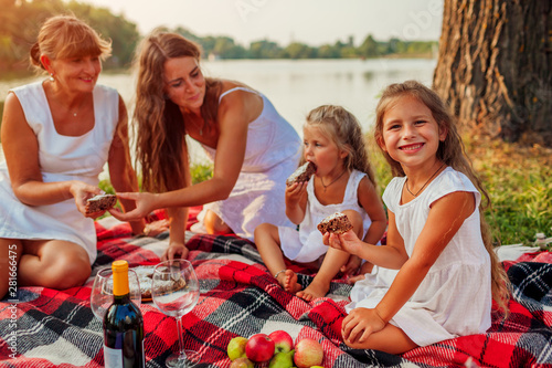 Family having picnic by summer river at sunset. Mother, grandmother and kids eating cake. Three denerations