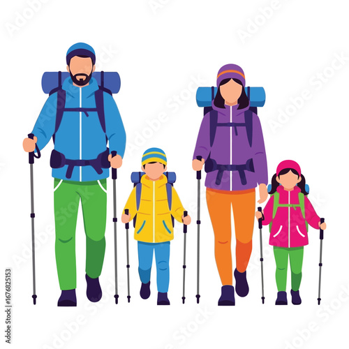 Family Hiking Expedition: A vibrant illustration depicts a family embarking on a hiking adventure, equipped with backpacks and hiking poles, traversing the great outdoors together.