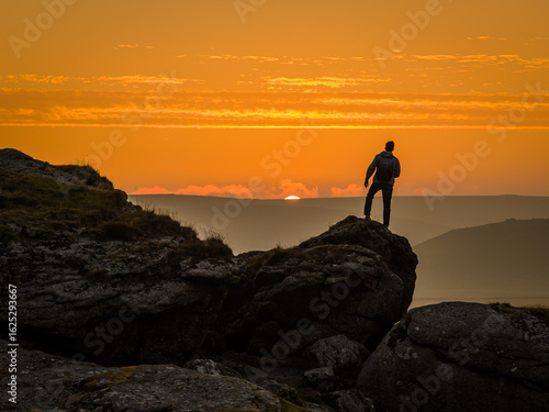 Family hiking on Dartmoor tors at sunset, silhouetted against dramatic skies in scenic moorland landscape