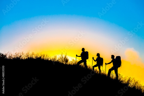 Family journey wild landscape Silhouettes of three people walking with backpacks other hiking gear up toward top of wild grass mountain mother father daughter bright luminous sunrise sky background