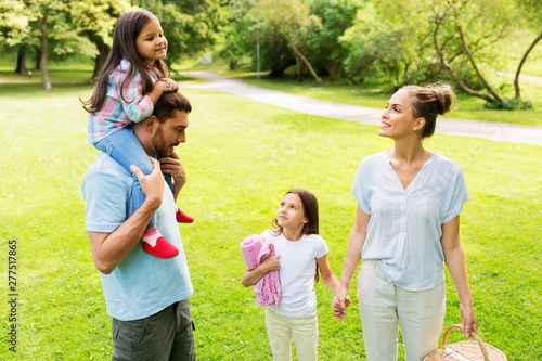 family, leisure and people concept - happy mother with picnic basket, father and two daughters in summer park