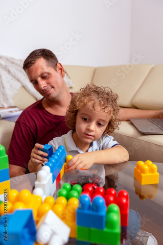 Family love concept. – cute boy playing with toys and his father at home.